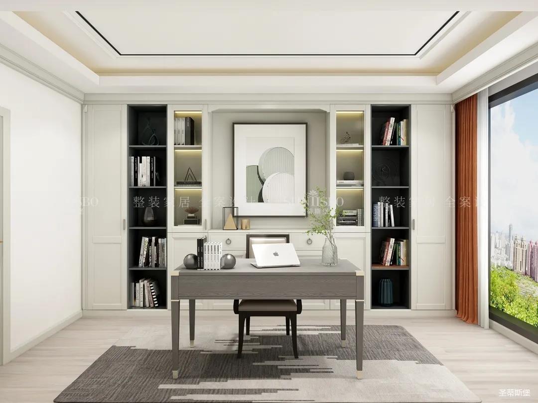 现代书房空间承载着更多的生活方式,它以各种形式出现在家的一隅。休闲之时,一杯清茶,一本书,靠着一张舒适书桌椅即可很好的释放自己的思绪。书桌背后设计成嵌入式一字型书柜,对称设计大气美观又实用。墙面利用率极高,而且能呈现出更加规整的空间感。
